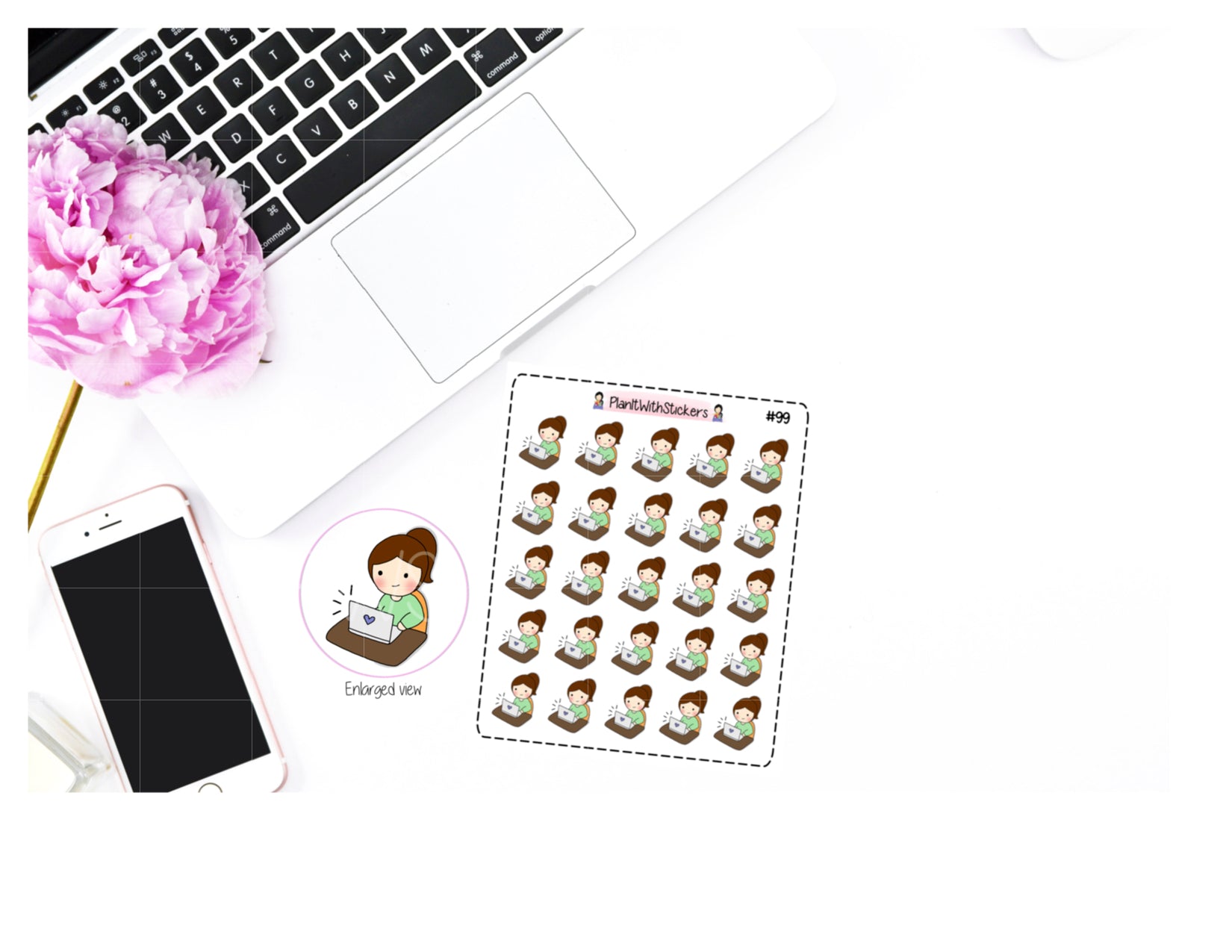 099 - Katie (Kawaii Girl) Desk Working Studying Laptop Typing Stickers for , Plum Paper, Recollections, and similar planners