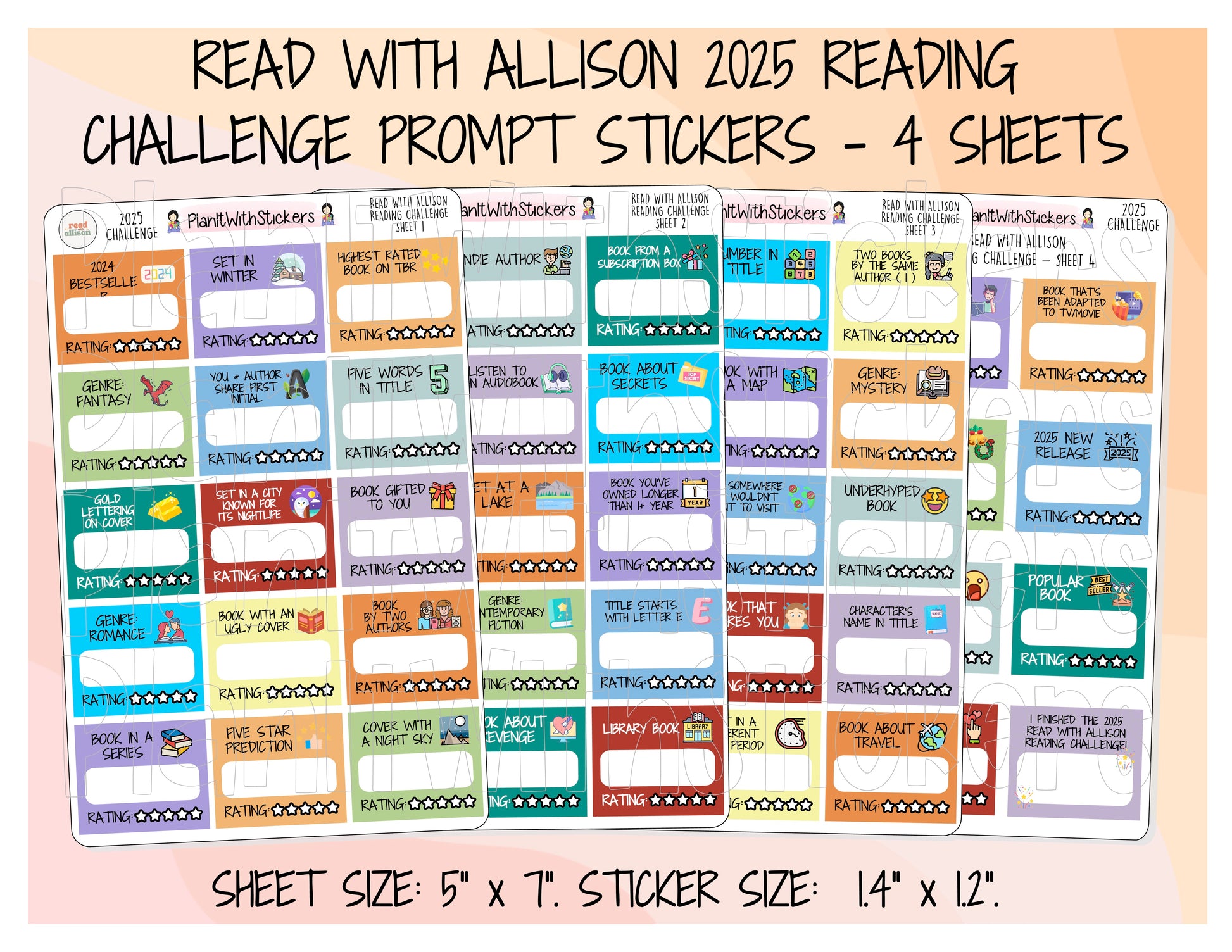 This listing is for a 3x 5x7 and 1x 3x7 sticker sheets for ReadWithAllison's 2025 Book Reading Challenge.