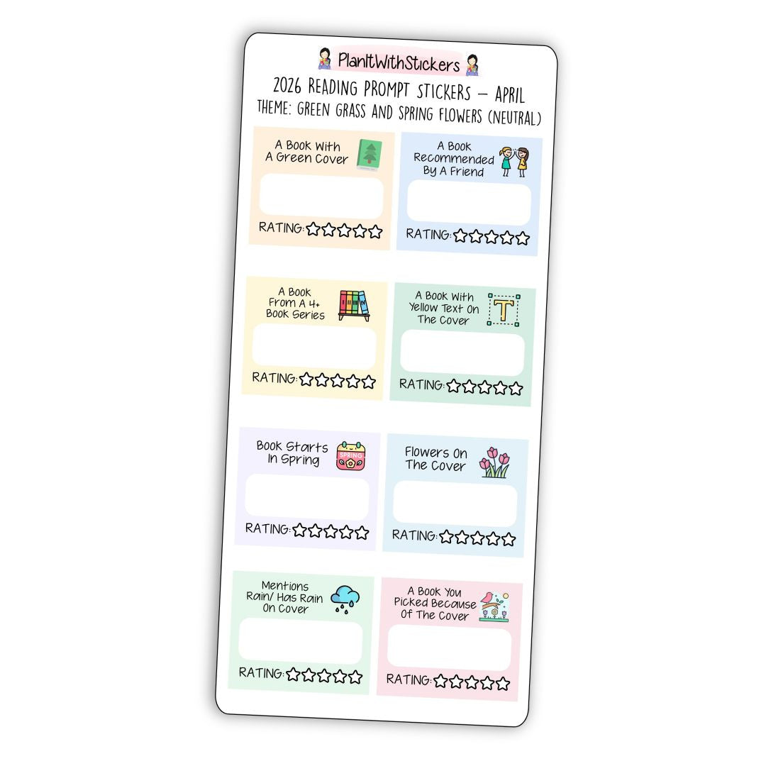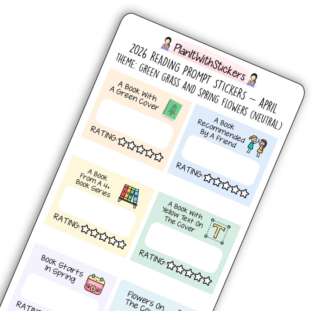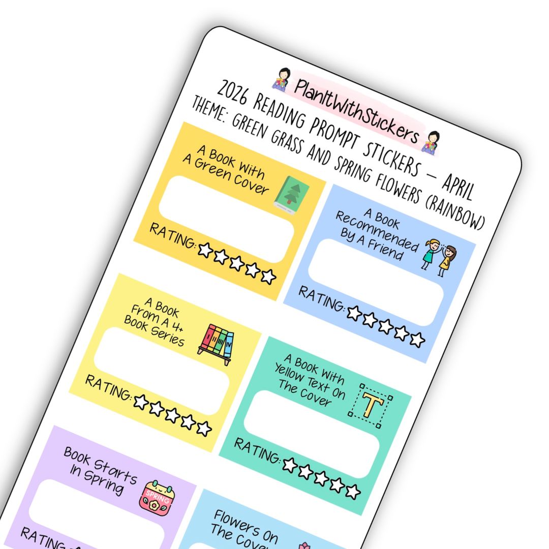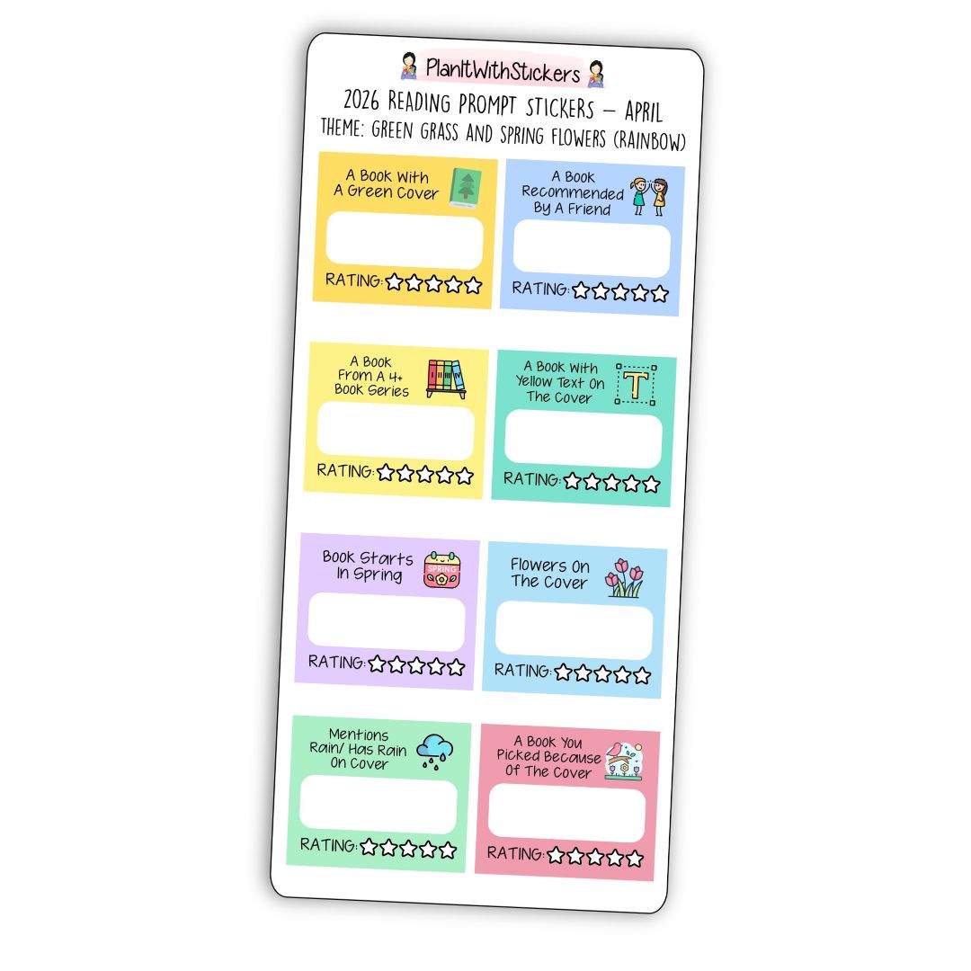 Each sheet includes 8 reading prompt stickers on a 7"×3" premium matte sticker sheet with a soft spring colour palette. Inspired by green grass, blooming flowers, and fresh seasonal themes, these prompts encourage fun discoveries like books with green covers, books recommended by friends, stories that start in spring, and books featuring flowers or rain.
