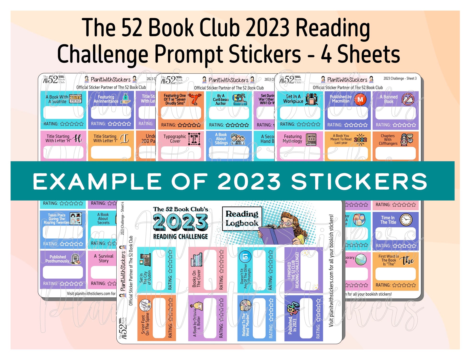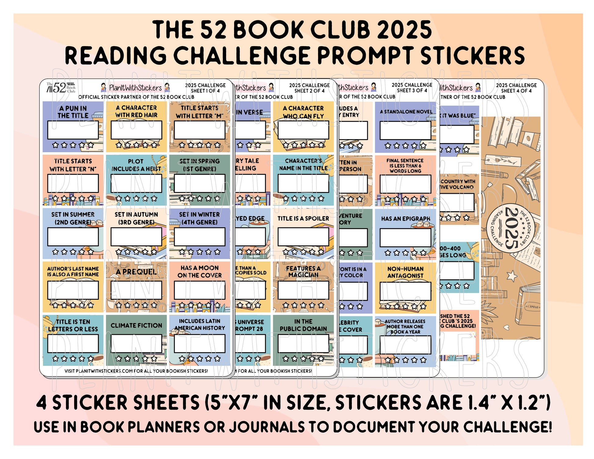 This listing is for a 4x 5x7 sticker sheets for The 52 Book Club's 2025 Reading Challenge.