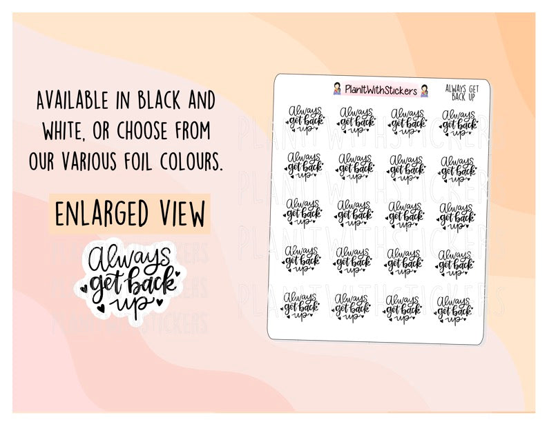 This listing is for a 4x3 sticker sheet of 20 Always Get Back Up Quote stickers in Black and White or various foil colours!