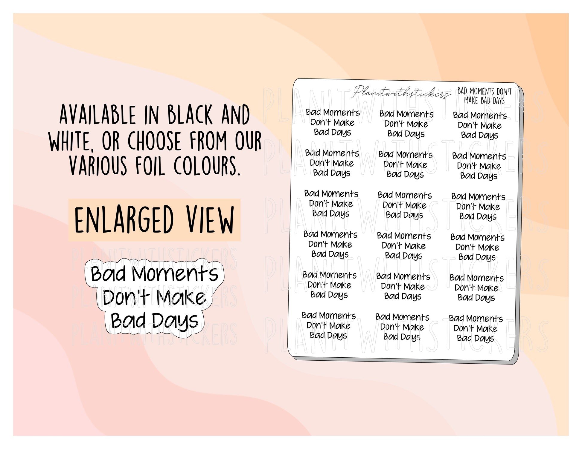 Includes one 4x3 sheet of 18 "Bad Moments Don't Make Bad Days" stickers.