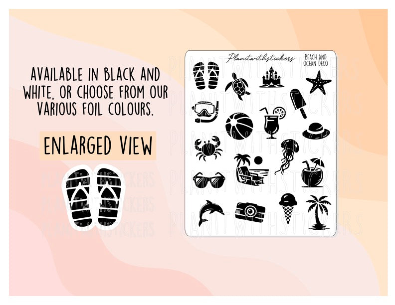 This listing is for one 4x3 sheet of 18 Beach and Ocean Deco stickers.