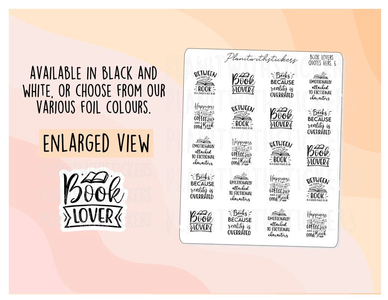 This listing is for a 4x3 sticker sheet of 20 Black and White Book Lover Quotes and Phrase Version 6 stickers.