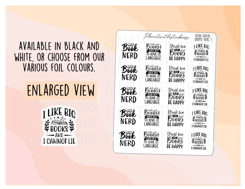 This listing is for a 4x3 sticker sheet of 20 Black and White Book Lover Quotes and Phrase Version 7 stickers.