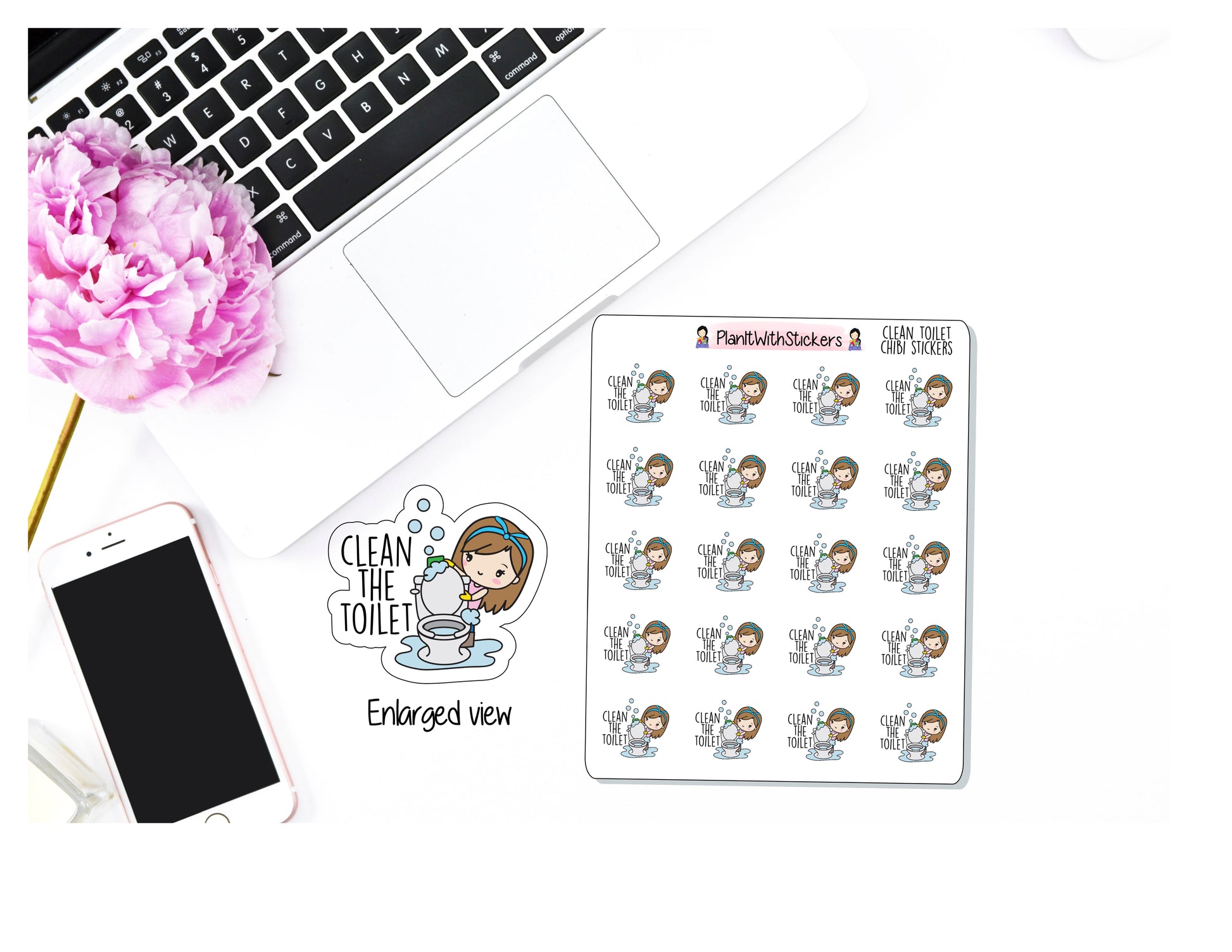 Cleaning Toilet, Chores Chibi Character Sticker for , Plum Paper, Recollections, and similar planners