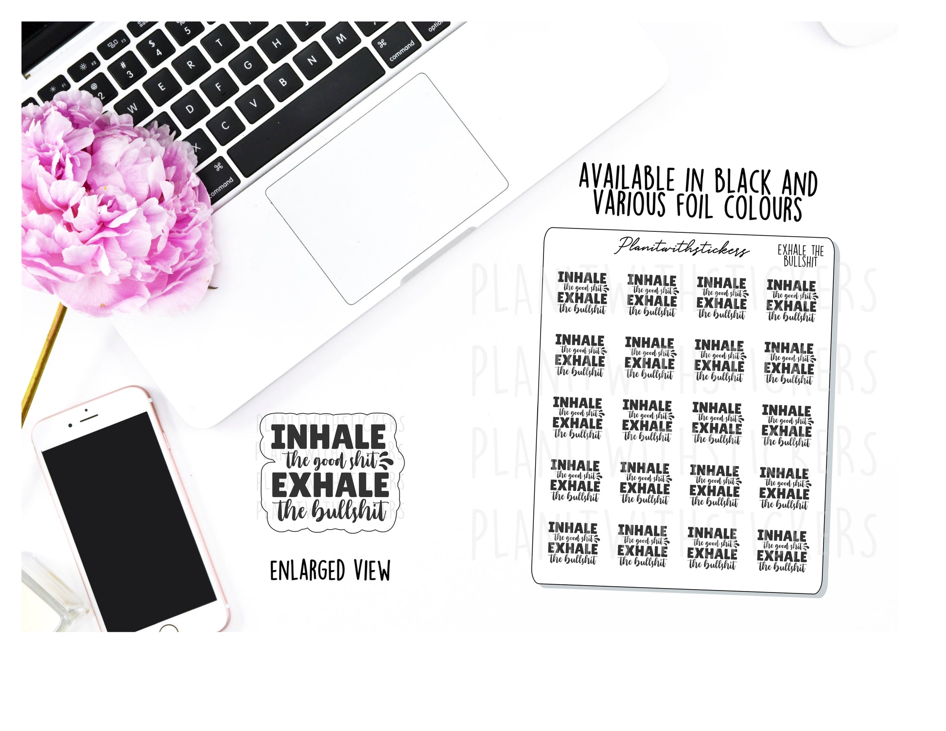 This listing is for one 4x3 sheet of 20 "Inhale The Good Shit, Exhale The Bad Shit" potty mouth stickers.