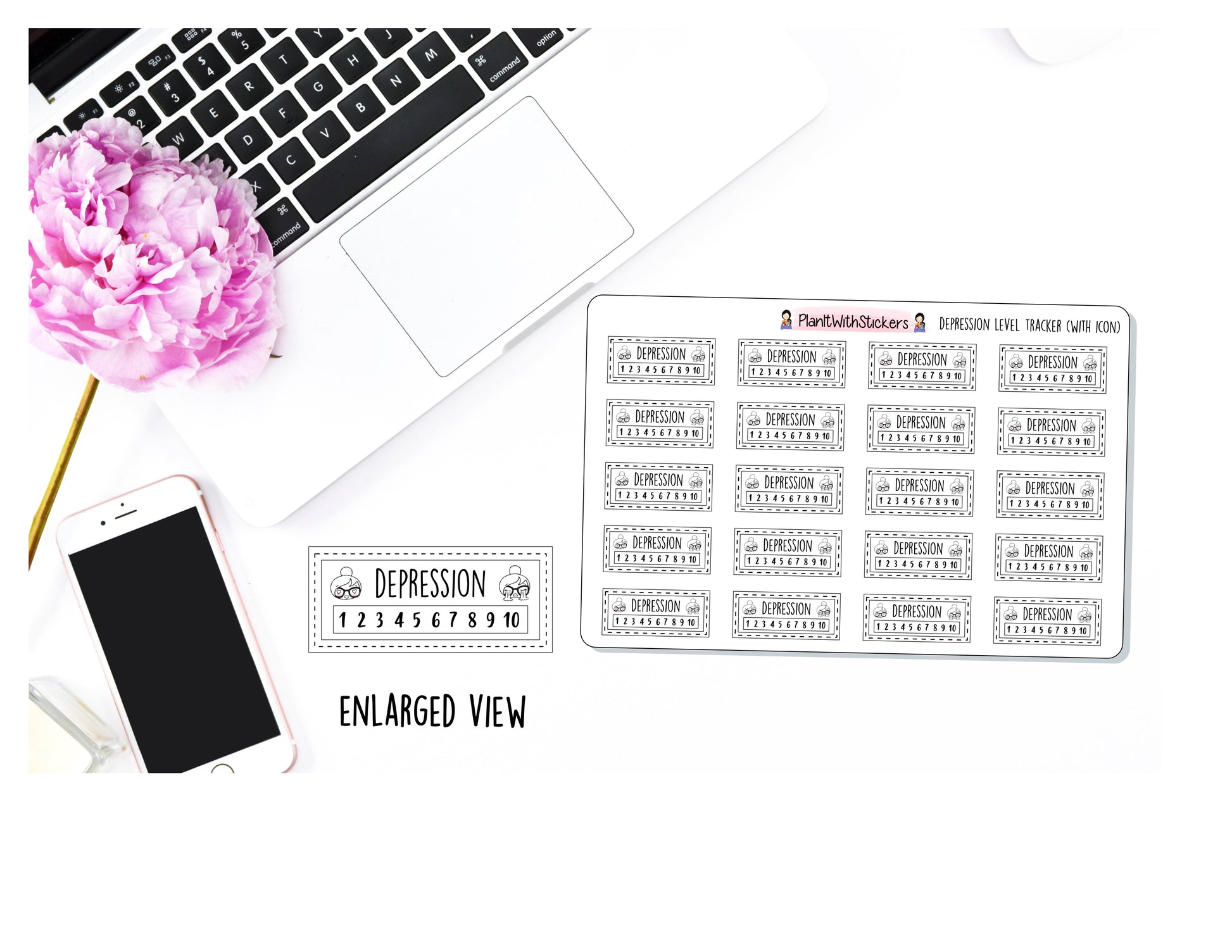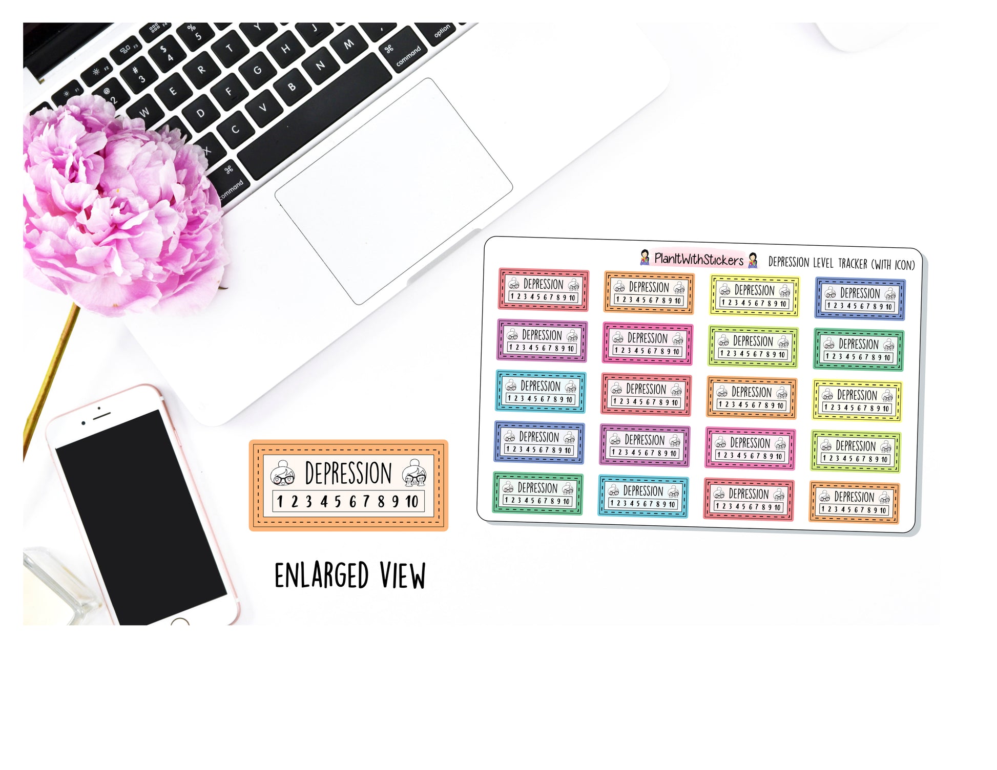 This listing is for one 5x7 sheet of 20 "Depression Level" tracker stickers. These can be used to track your depression level/occurrence of depressing thoughts on a daily basis or a weekly basis.