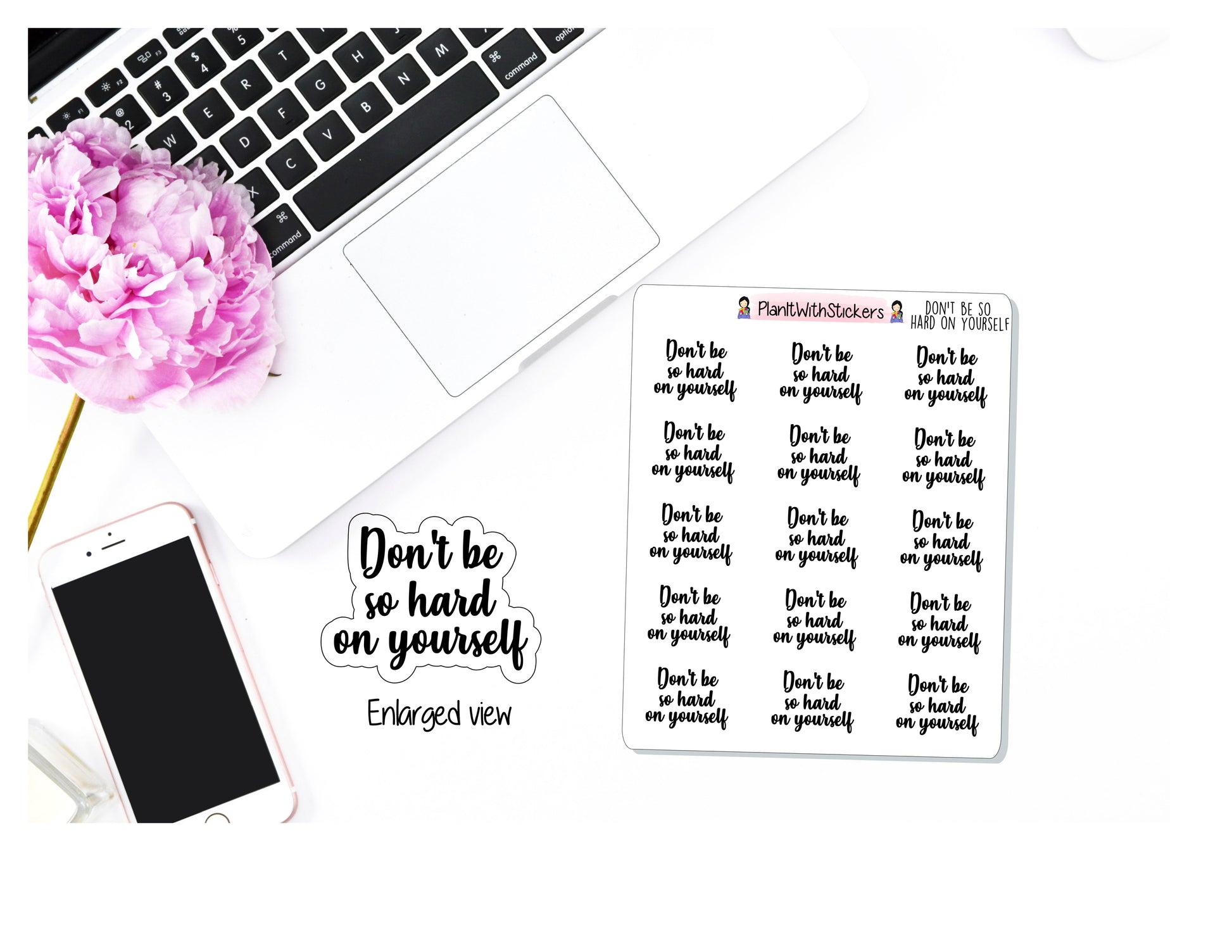 Includes one 4x3 sheet of 15 "Don't Be So Hard On Yourself" stickers to use in your planner to remind you that we are our own worst critic. You're doing better than you think - don't be so hard on yourself!