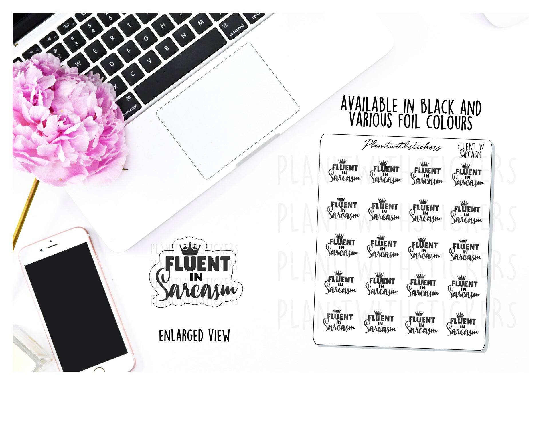 This listing is for one 4x3 sheet of 20 "Fluent In Sarcasm" potty mouth stickers.