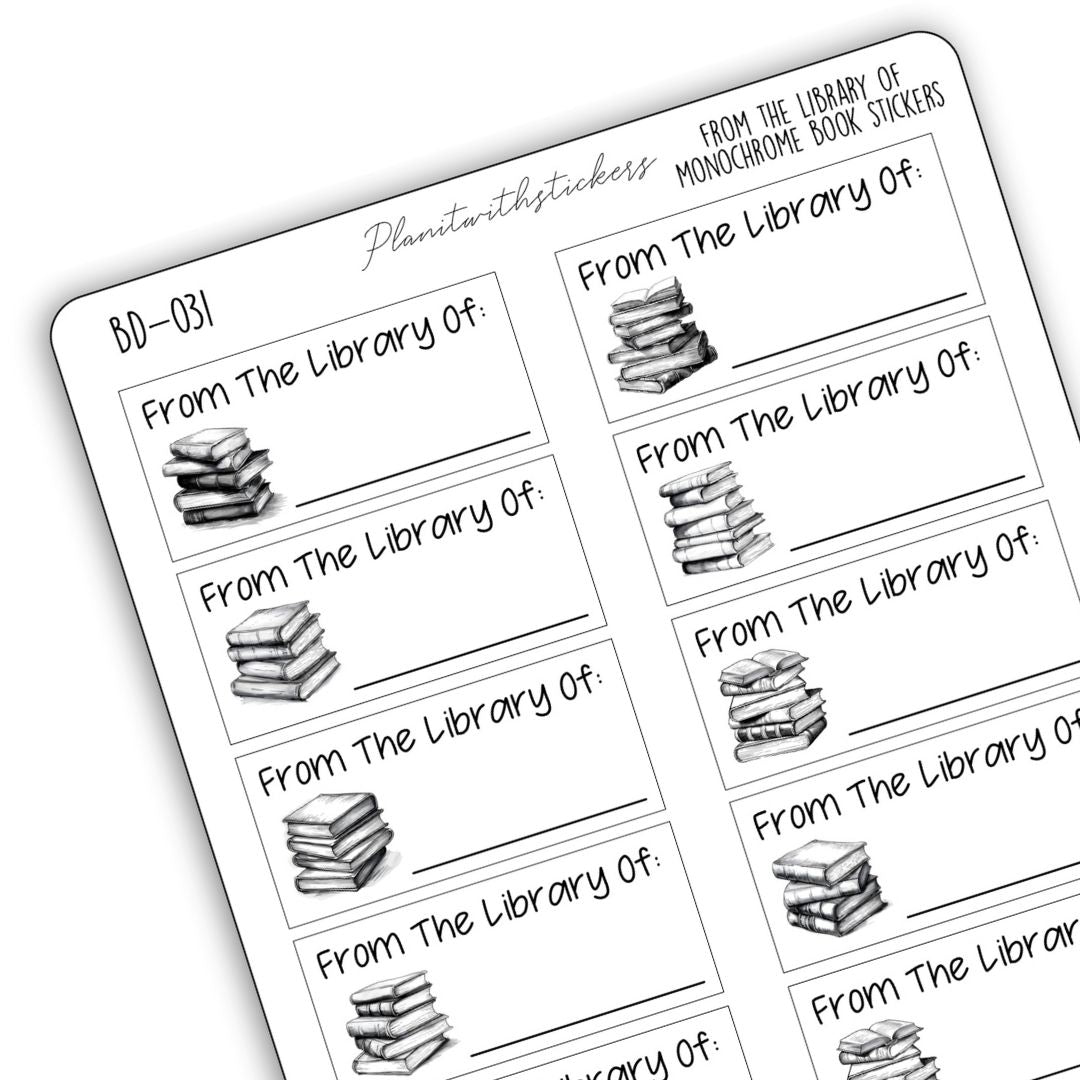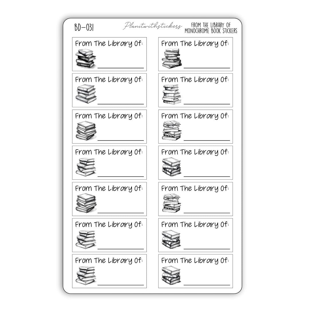 This listing is for a 5x7 sticker sheet of 14 "From The Library Of" Book Labelling stickers with monochrome book stack icons.