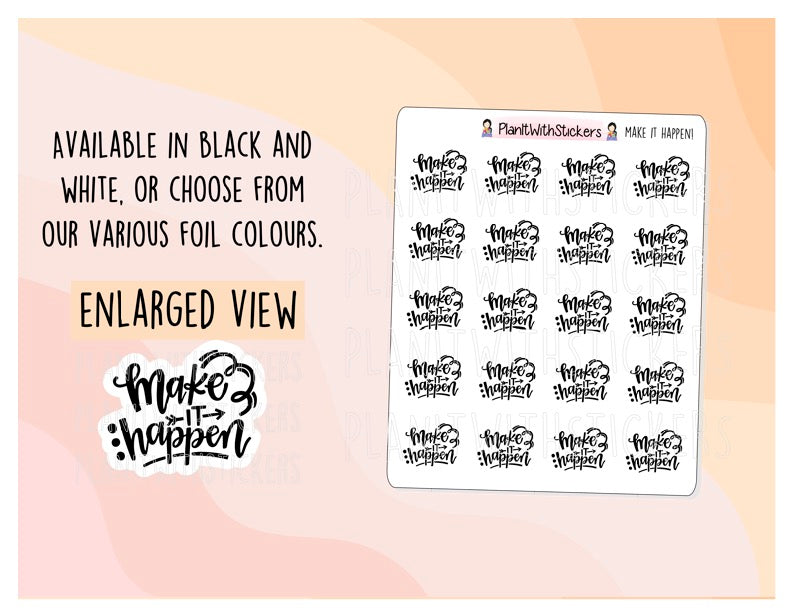 This listing is for a 4x3 sticker sheet of 20 Make It Happen Quote stickers in Black and White or various foil colours!