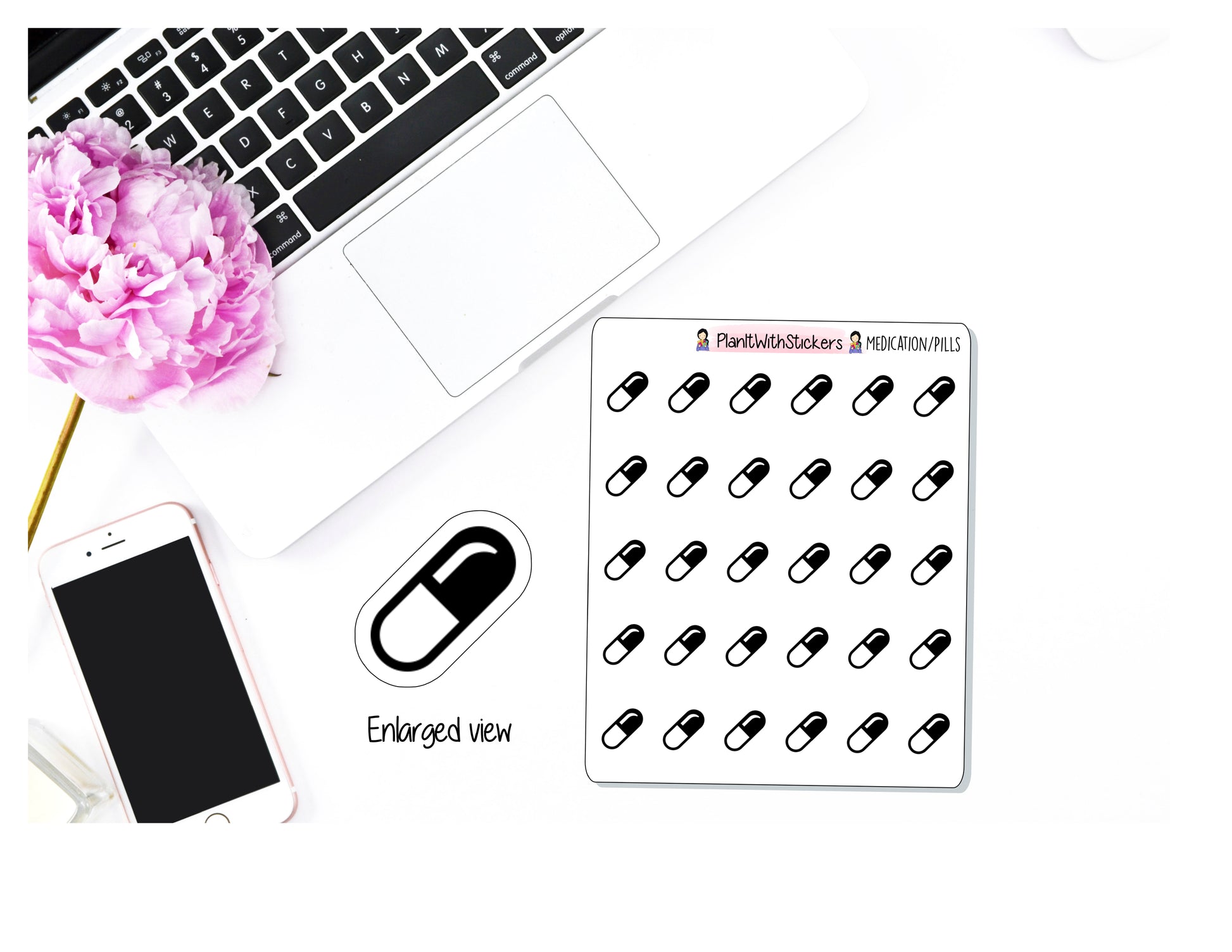 This listing is for one 4x3 sheet of 30 Medication/Pill Icon stickers that can be used as reminders for taking certain medications/vitamins or to refill them!