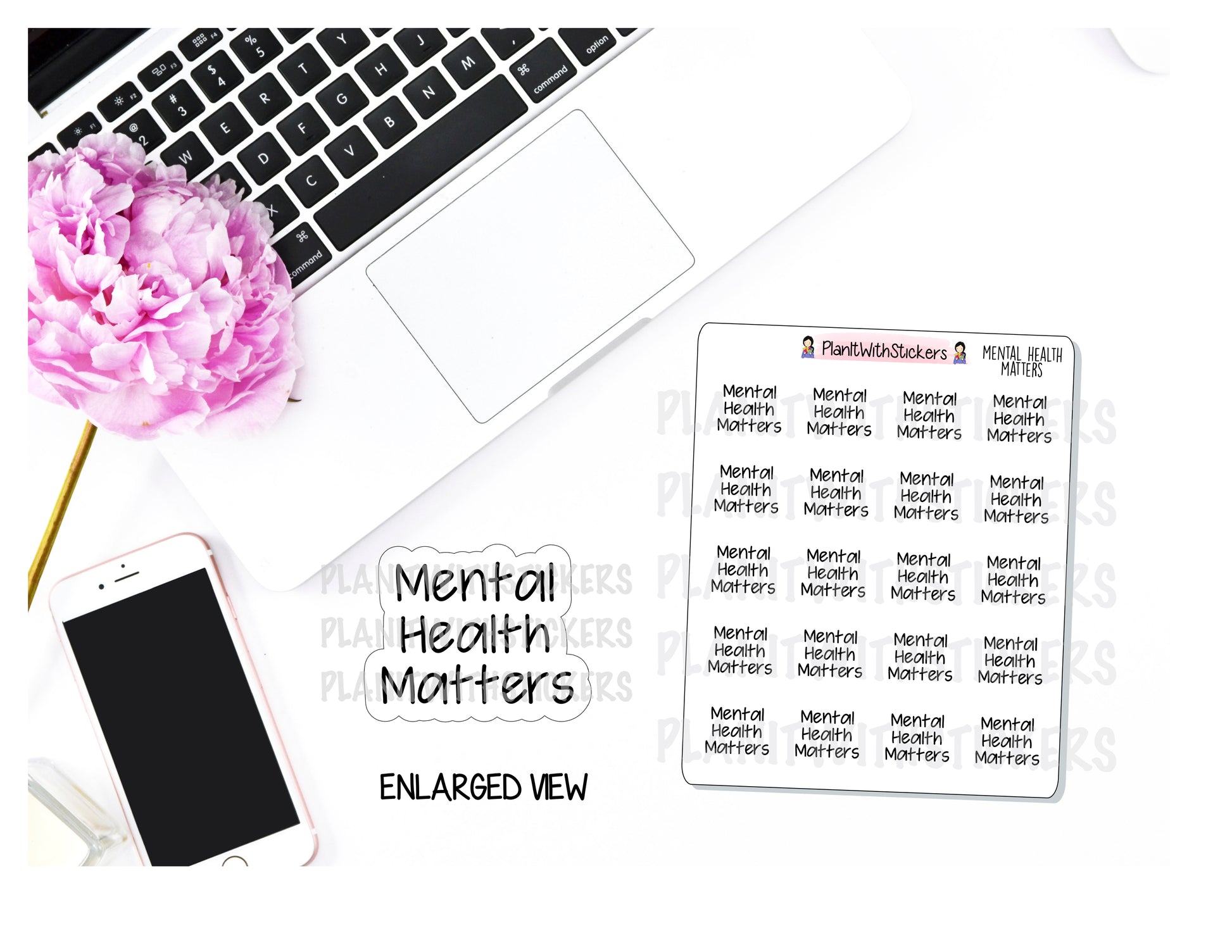Includes one 4x3 sheet of 20 "Mental Health Matters" stickers to use in your planner to remind you it's just as important to take of yourself, if not more, as it is to take care of others.