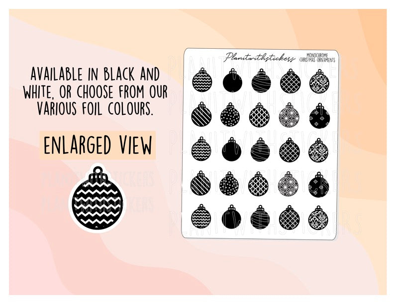 This listing is for one 4x3 sheet of 25 Monochrome Christmas Ornaments Quote stickers on Sheet 1 of this collection.