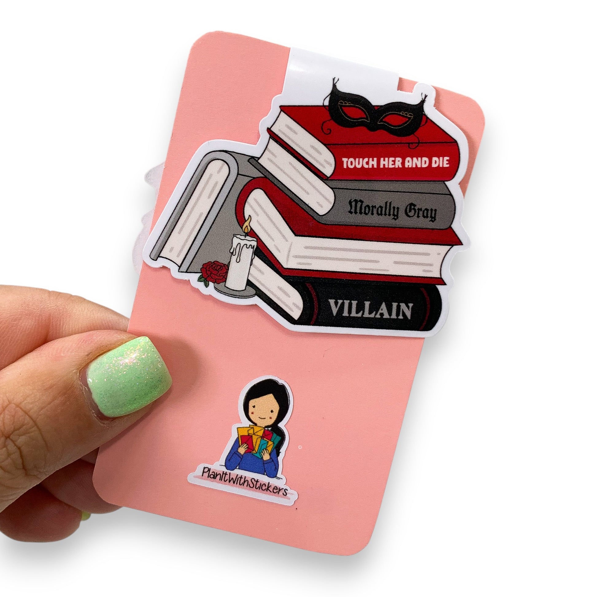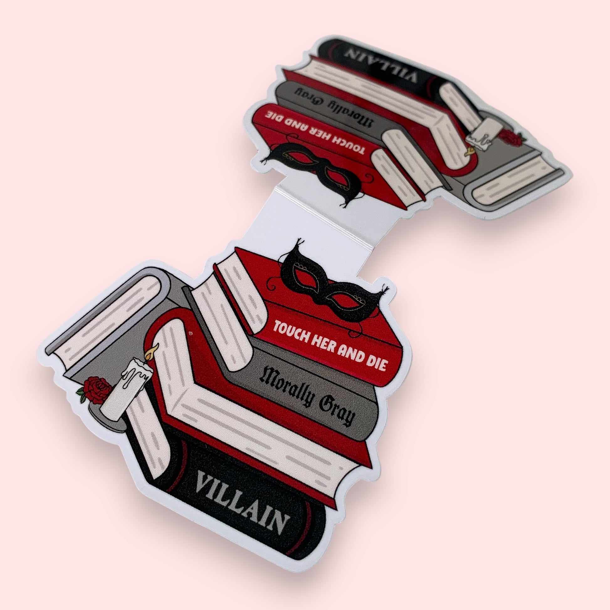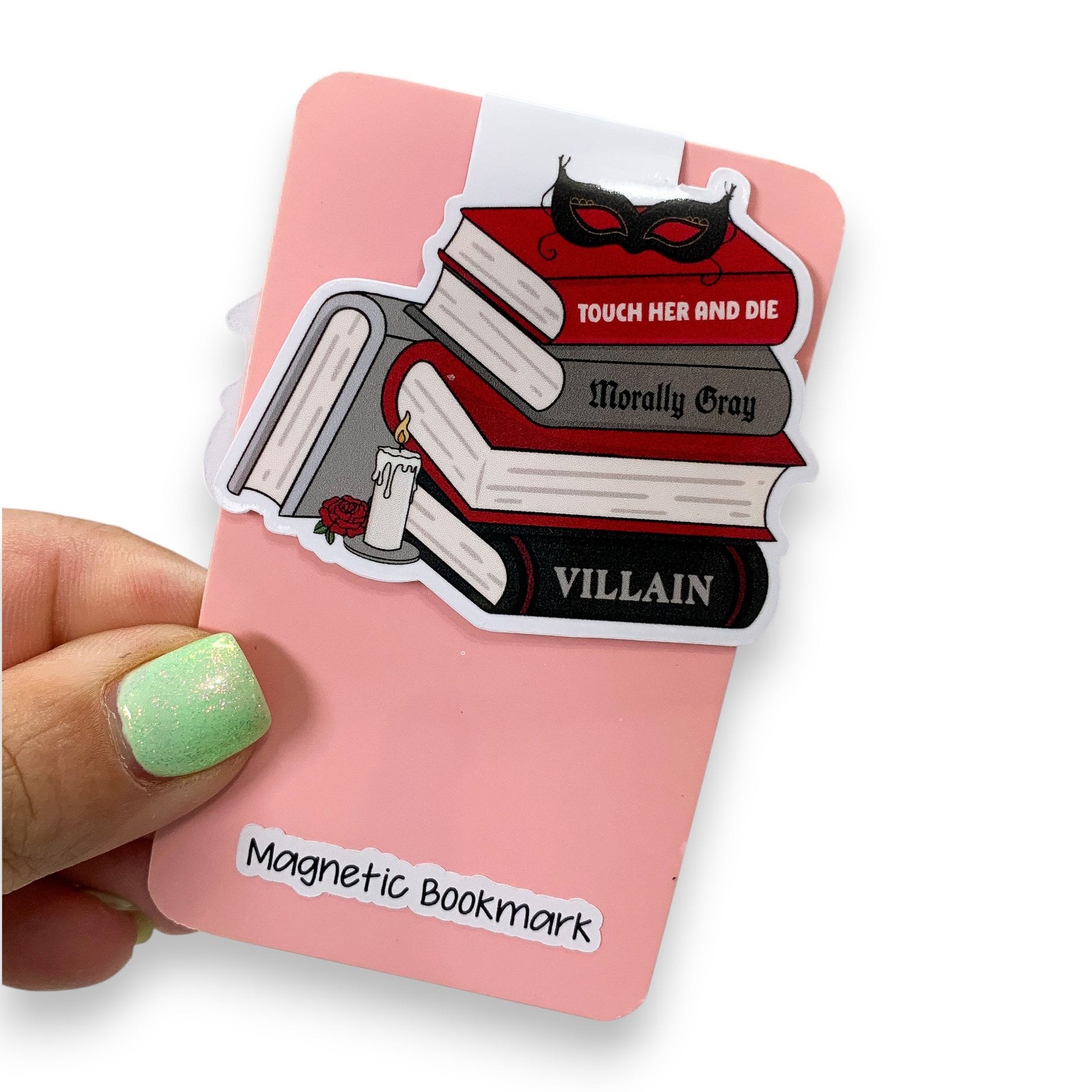 This listing is for ONE (1) magnetic bookmark featuring a book stack design with a mask and candle doodles, and morally grey text on the book spines.