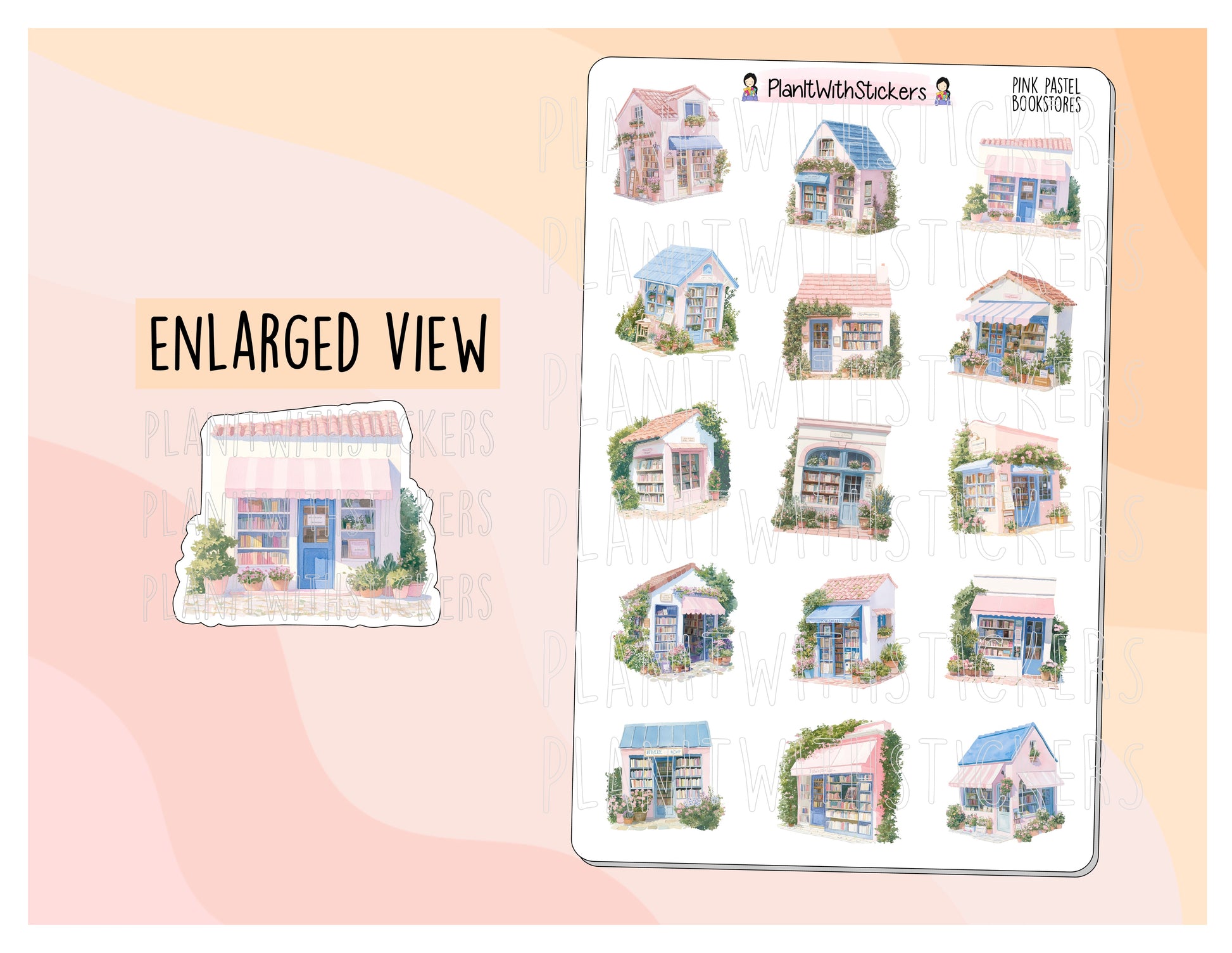 This listing is for a 5x7 sticker sheet of Pink Pastel Book Shop Store Front stickers. Perfect for adding beautiful colour and joy to your journal/planner spreads!
