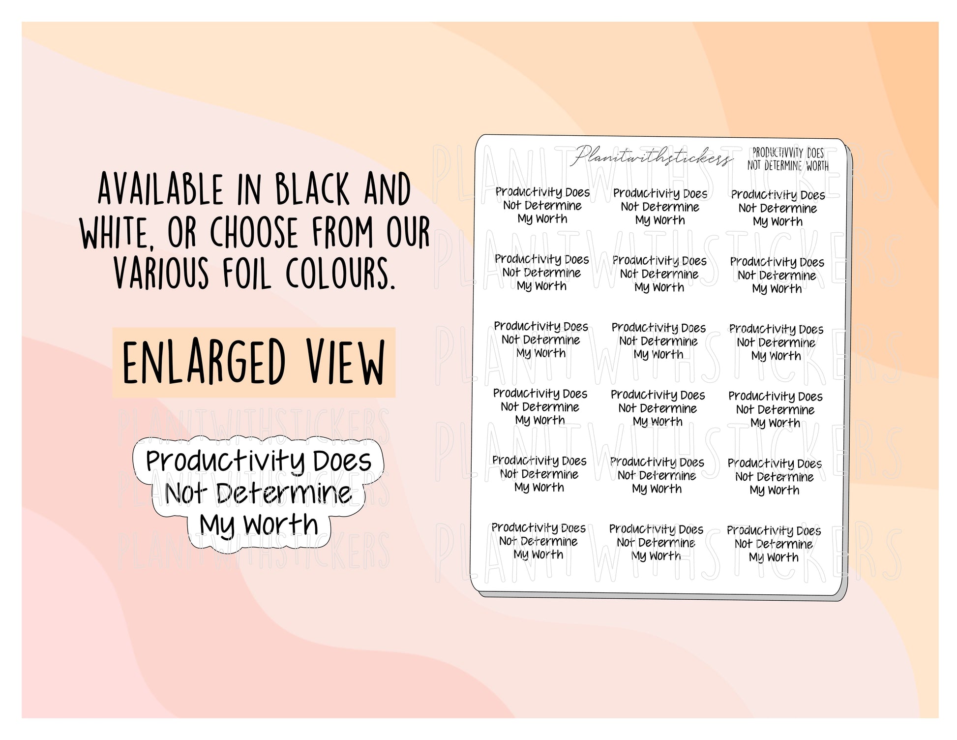 Includes one 4x3 sheet of 18 "Productivity Does Not Determine My Worth" stickers.