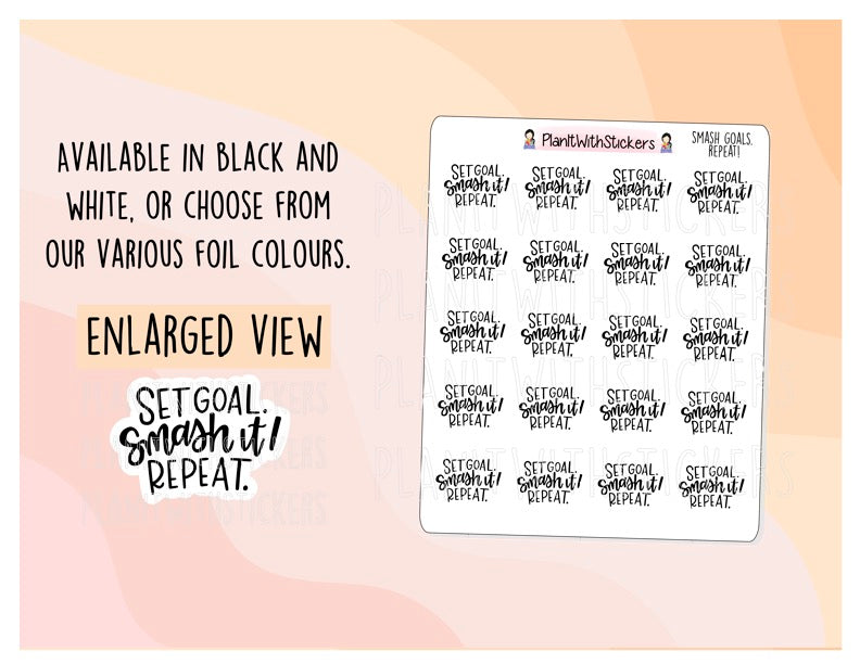 This listing is for a 4x3 sticker sheet of 20 Set Goal. Smash it. Repeat. Quote stickers in Black and White or various foil colours!