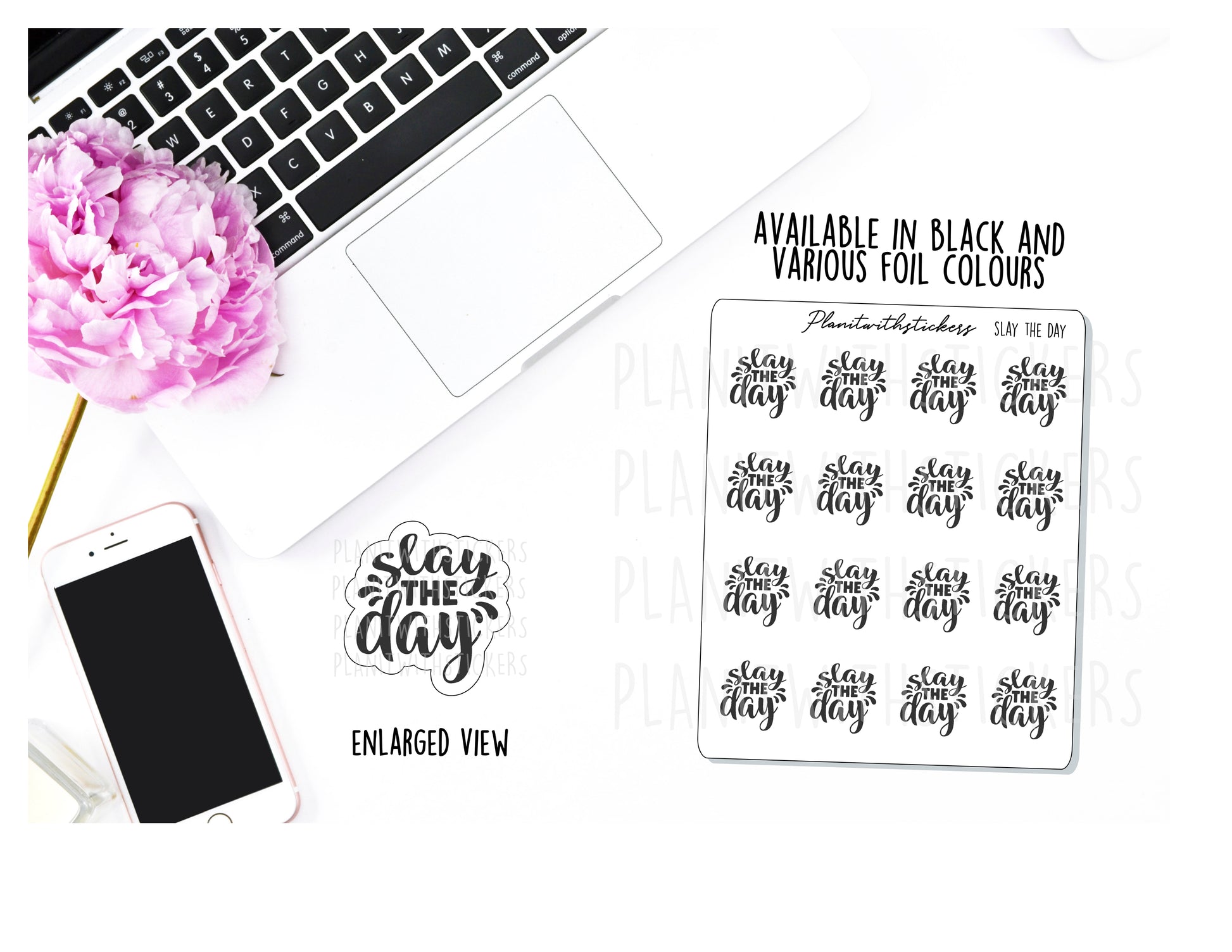 This listing is for one 4x3 sheet of 16 "Slay The Day" potty mouth stickers.
