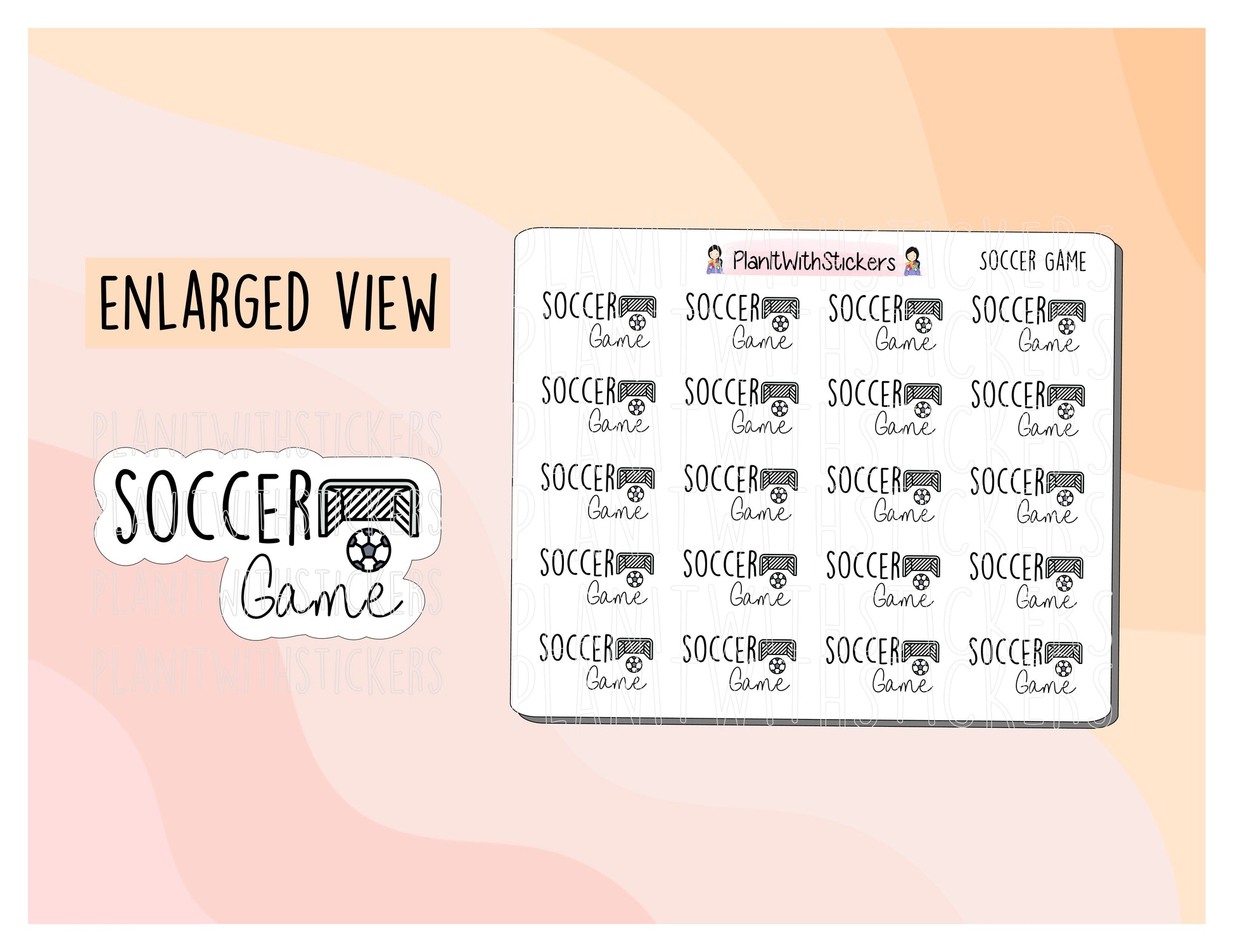This listing is for one 4x3 sheet of "Soccer Game" stickers - perfect to plan ahead or keep track of days when there is a soccer game!