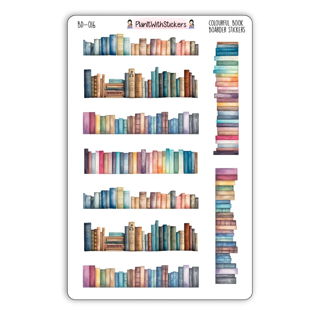 This listing is for a 5x7 sticker sheet of 9 Colourful Book Stack Border stickers. These stickers are perfect for adding pops of colour in your planner/journal!