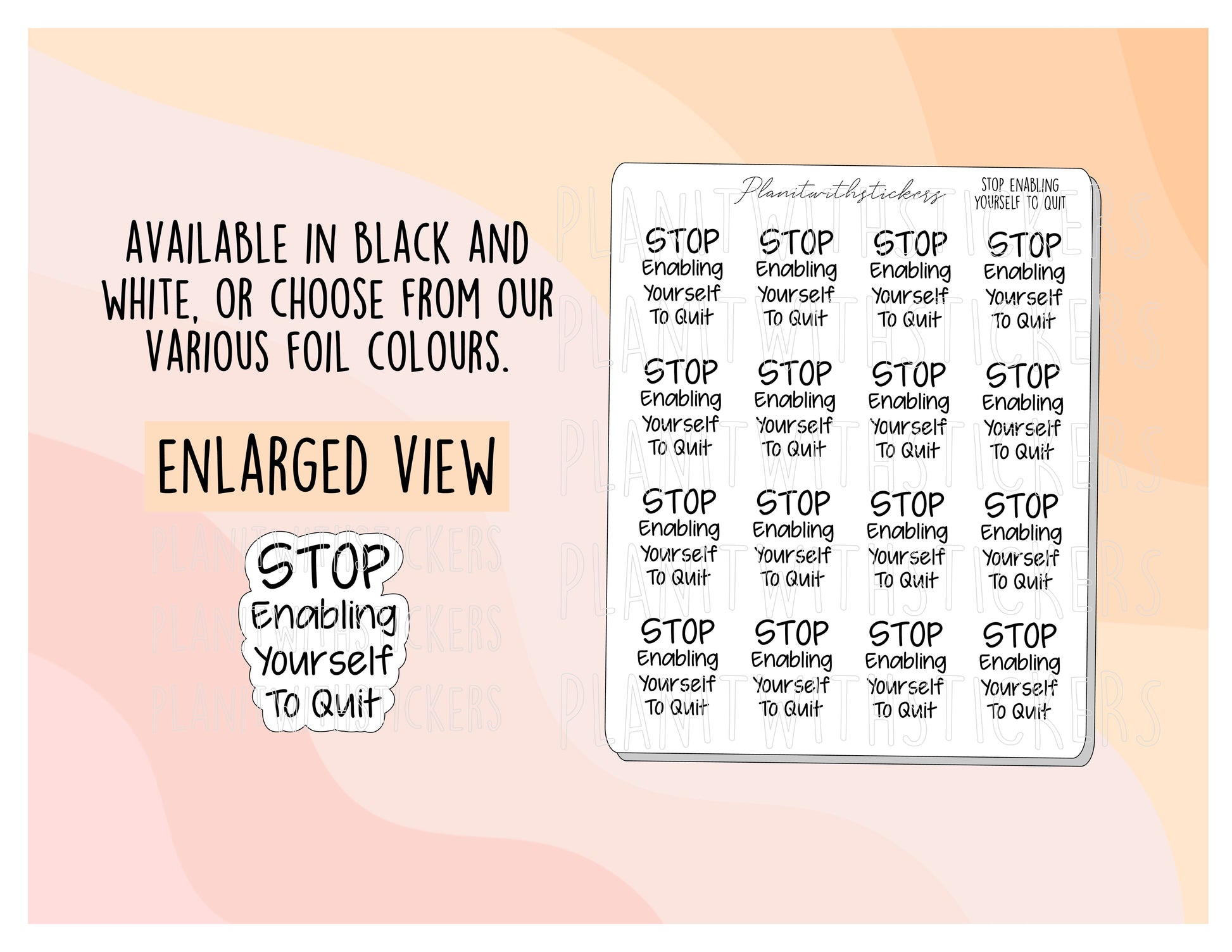 Includes one 4x3 sheet of 18 "Stop Enabling Yourself To Quit" stickers.