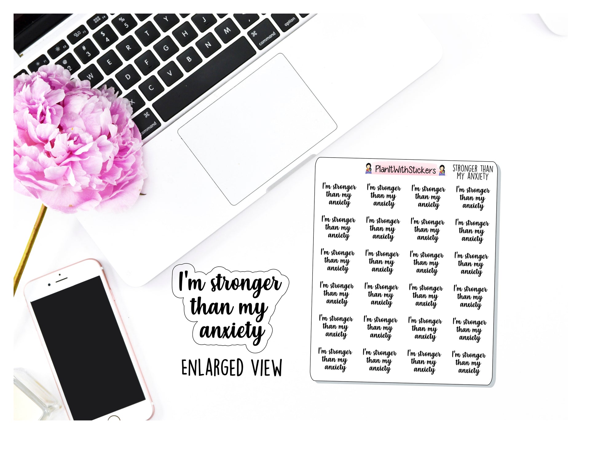 This listing is for one 4x3 sheet of 24 "I Am Stronger Than My Anxeity" stickers. We are our thoughts, and we believe what we tell ourselves. Don't let the bad days hold you down, because you are still here after all those bad days. You are stronger than you realize.