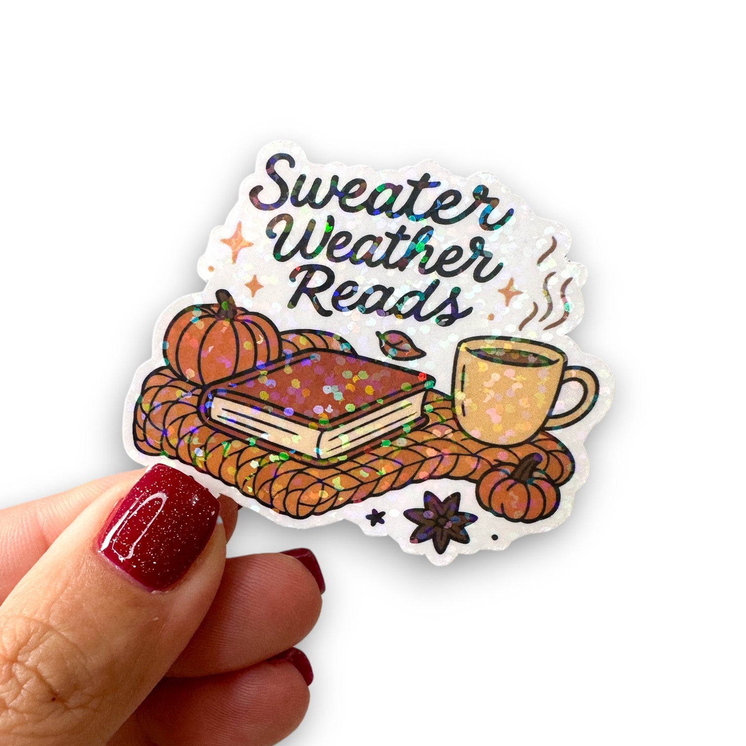 This charming die cut sticker captures the warmth of fall reading with a stack of books resting on a knit blanket, a hot drink steaming nearby, and pumpkins framing the scene. “Sweater Weather Reads” ties it all together, making it a must-have design for book lovers who embrace cozy vibes.