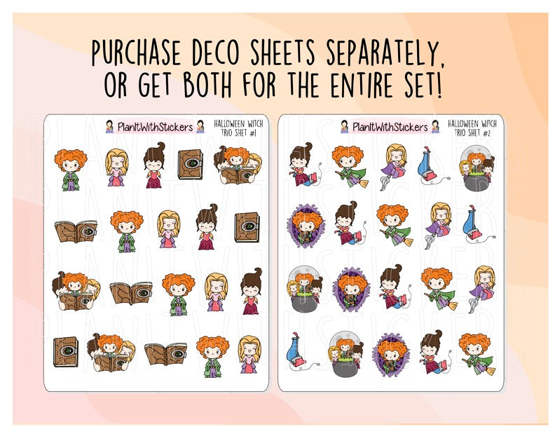 This listing offers TWO (2) different 4x3 sheets of our Halloween Witch Trio Deco stickers (inspired by H0cus P0cus).